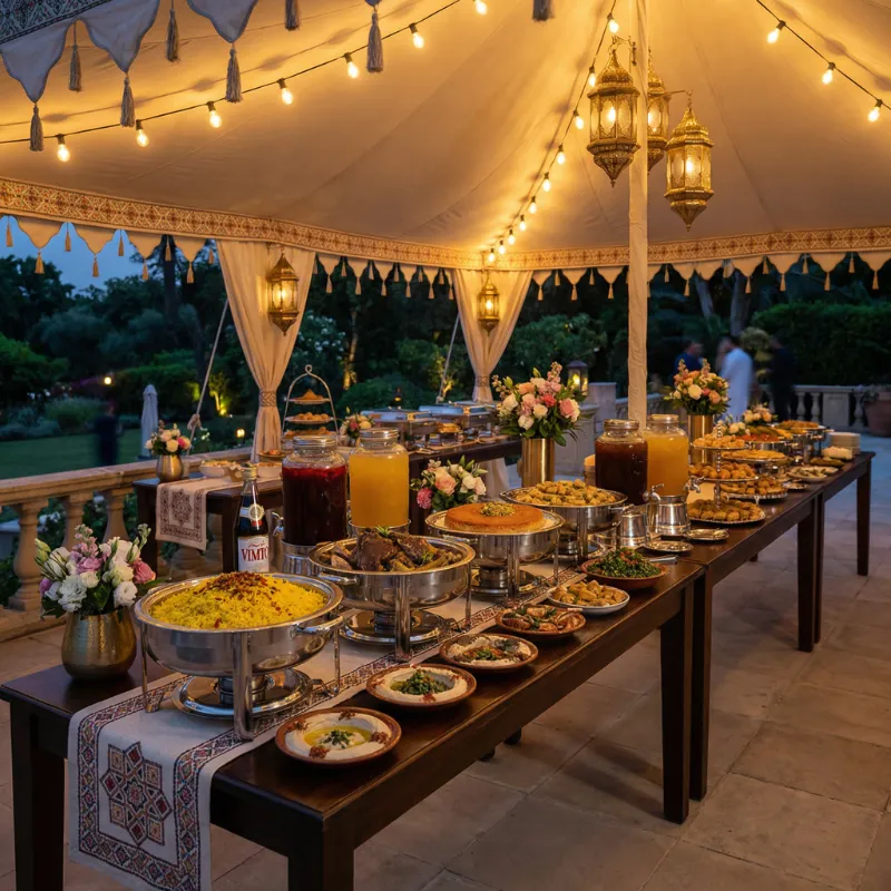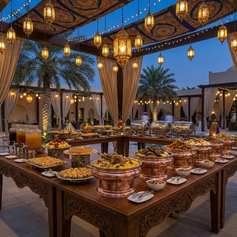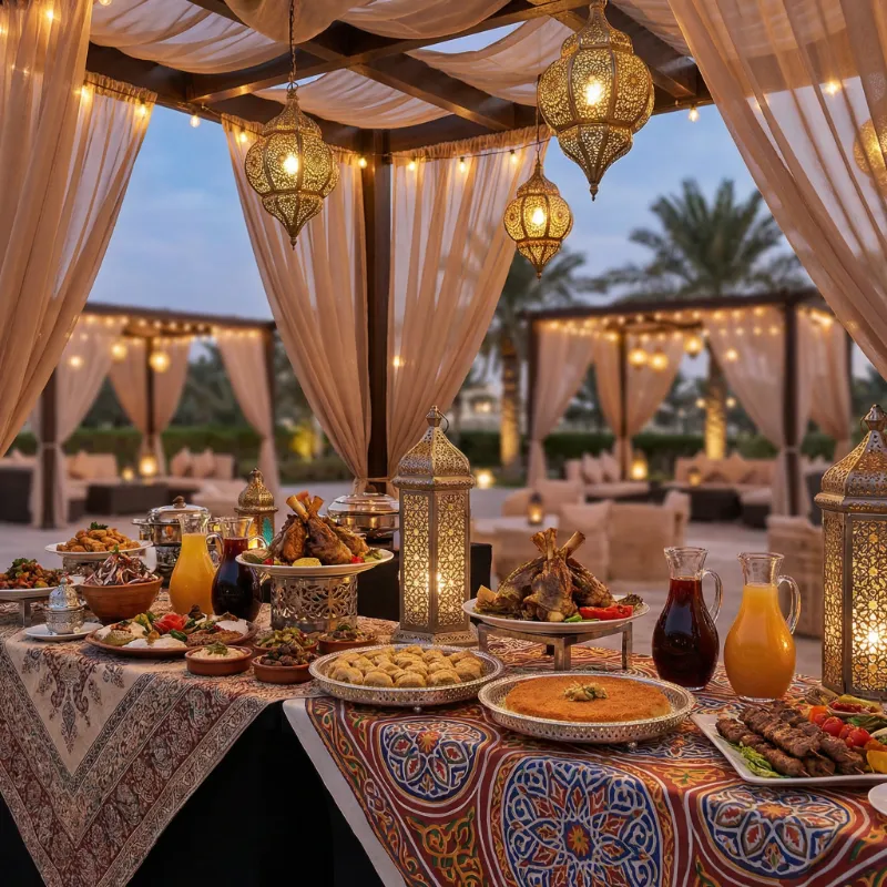 Family gatherings and corporates outing in Ramadan Iftar and Sohour with warm-luxury presentation, menus, catering service, and unique experience.